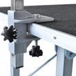 The table is rubber surfaced which ensures your pet's safety. The rugged surface makes it easy to clean and hair and debris can be wiped down easily. The clamp-on adjustable grooming arm and security noose make it easier to groom your dogs and kitties. Made of solid iron frame, the table is sturdy and durable for years of use.